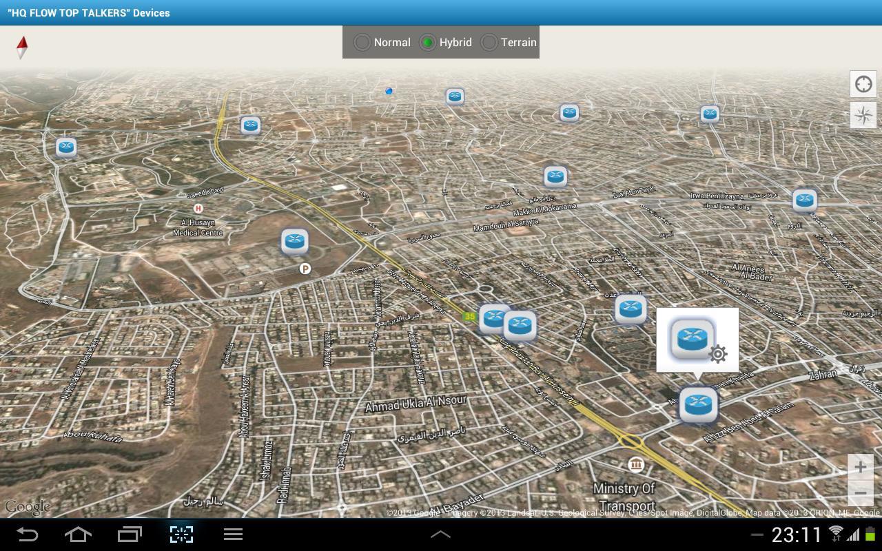 The popup bubble for each of the defined Router devices includes a "Settings" icon which links the user to the device's credentials which the user needs to fill-in as per the actual router configuration.