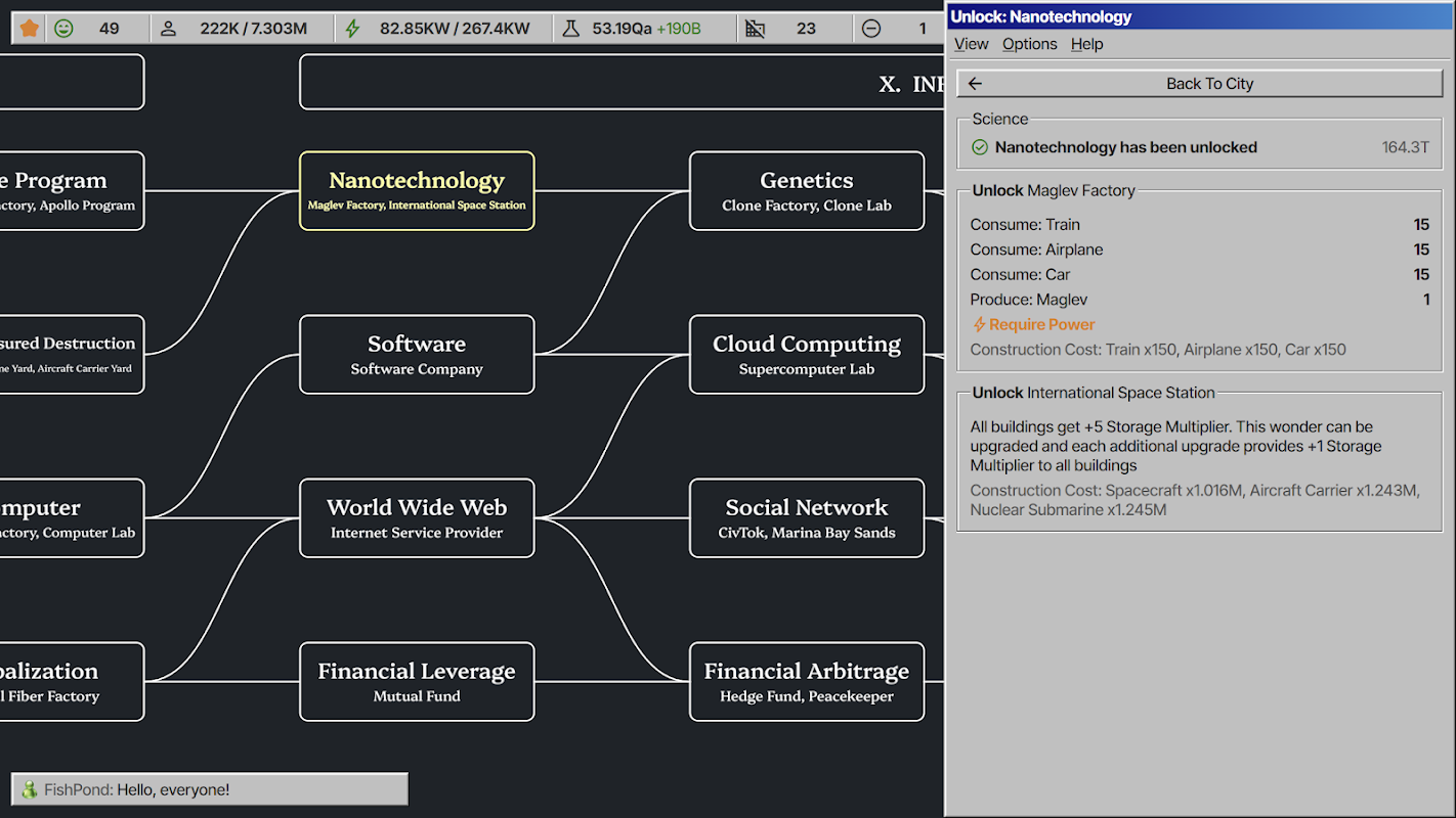 Исследуйте и разблокируйте обширное дерево технологий с более чем 100 технологиями: от охоты и собирательства, через письмо и математику, вплоть до виртуальной реальности и искусственного интеллекта. По мере развития технологий вы разблокируете больше игровых систем и механизмов, которые значительно расширят игровой процесс.