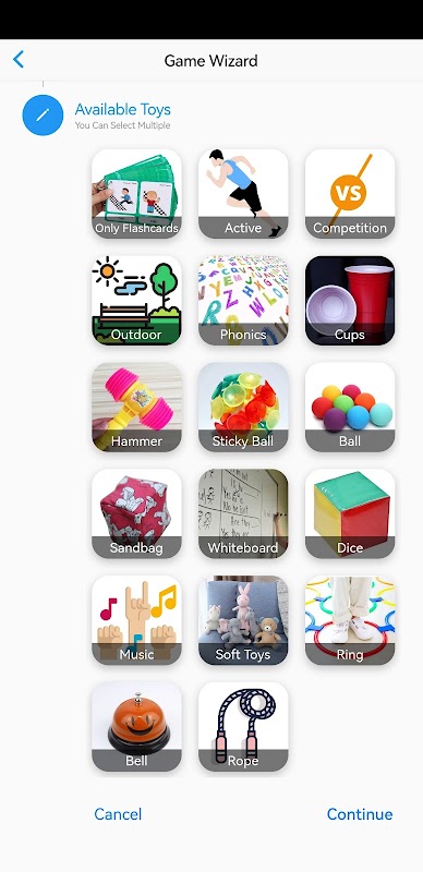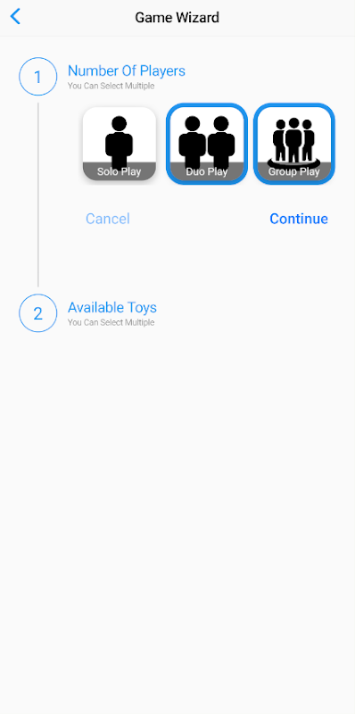 Select the number of players you wish for the game. Then select the toys you have with you. The wizard will show you ONLY the games with the selected number of players. But it will show you all the games that have any of the toys you selected