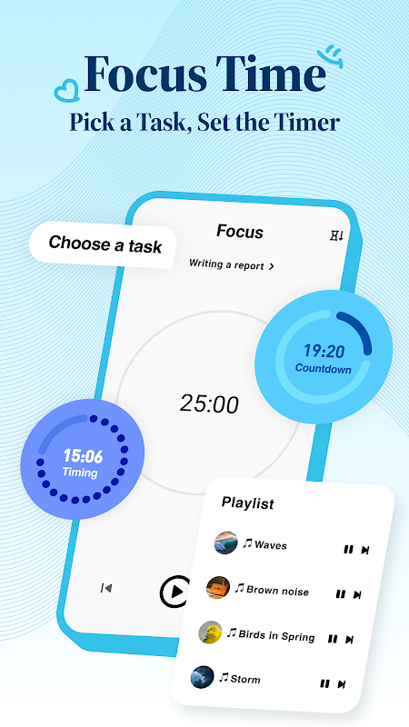 ⏳ Таймер фокусировки Таймер фокусировки Pomodoro, который поможет вам не сбиться с пути. Настраивайте продолжительность фокусировки и перерывов, переключайтесь между режимами обратного и обратного отсчета и оставайтесь в зоне с фоновыми звуками, включая белый шум, звуки природы и многое другое.