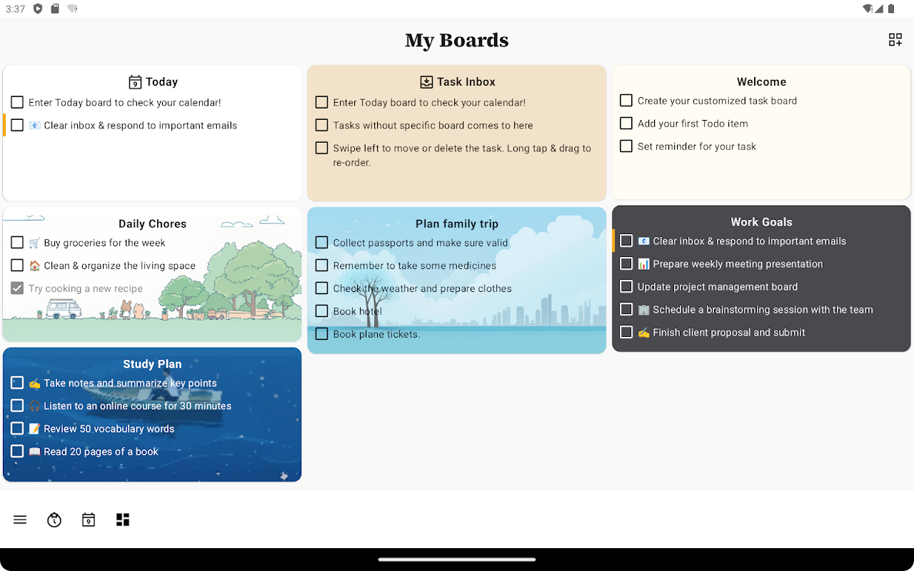 Clear Todo поможет вам легко управлять списком дел. Он предлагает интуитивно понятную и настраиваемую систему досок задач, которая помогает организовывать задачи по категориям или темам. Благодаря понятному интерфейсу и календарю вы можете отслеживать свои задачи и список дел в двух измерениях: по категории доски и временной шкале.