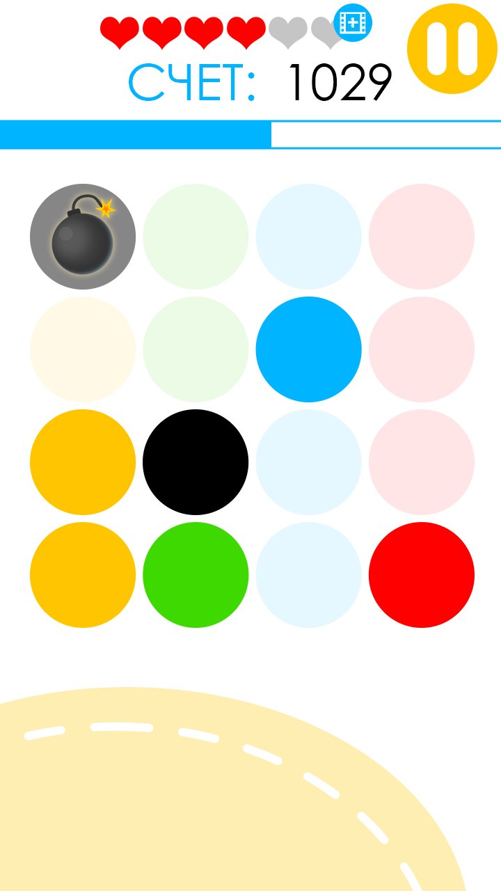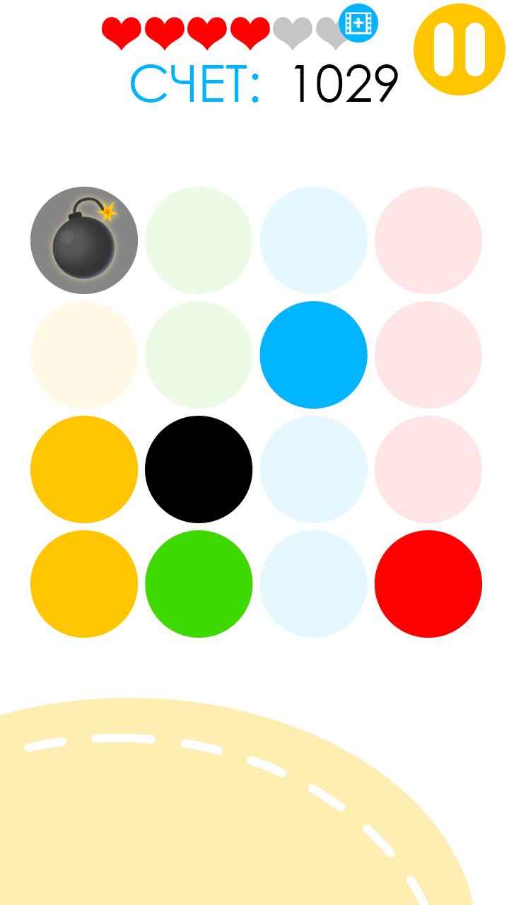 Игра заканчивается, если вы нажали на черный кружок, либо когда на игровом поле не осталось свободного места.