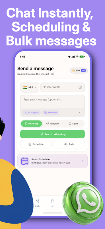 • Отправляйте сообщения любому пользователю WhatsApp/Telegram/Signal без сохранения его контакта