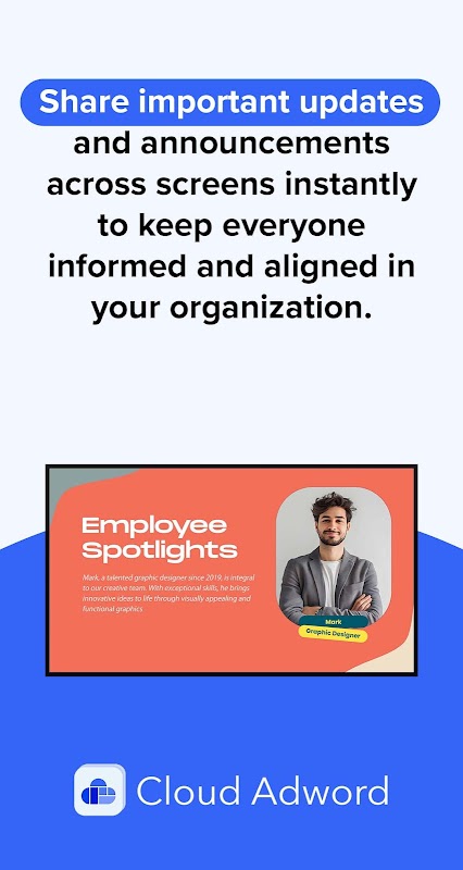 Приложение доставки, созданное для создания, дизайна и планирования контента на любом цифровом экране. Облако Adword позволит вам добавить ваше устройство, использовать макет по умолчанию или создать свой собственный макет. Просто перетащите медиа из библиотечных виджетов; HD-видео, динамические слайд-шоу, погода, Facebook, Twitter, Instagram, RSS, виртуальная очередь, интеграция сайтов, интерактивные опросы и многое другое.