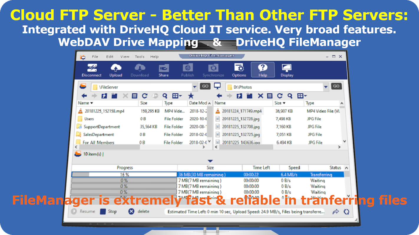 Облачный FTP-сервер DriveHQ очень быстр, имеет практически неограниченную пропускную способность и чрезвычайно надежен, обеспечивая бесперебойную работу более 99,99%. Он поддерживает безопасный FTP с FTP через SSL/TLS (FTPS/FTPES) и SFTP.