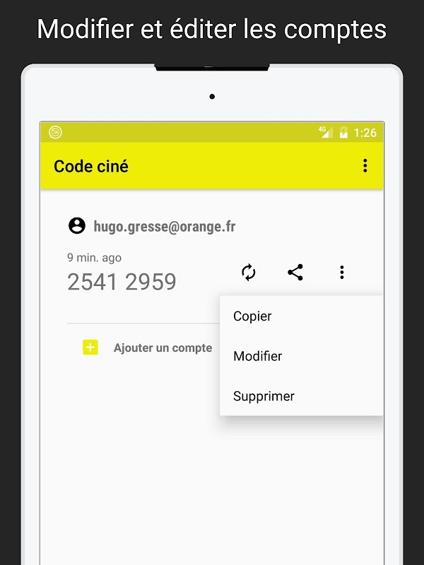 Code ciné est une application gratuite et open-source (FOSS) non-officielle qui récupère pour vous vos codes cinéma avec votre compte Orange Cinéday (tout droit réservés) le mardi matin à 9h. Vous pouvez ajouter une infinité de compte Orange et les données de vos comptes sont conservées en sécurité avec les dernières normes de sécurités (AES 128, CBC, PKCS5 padding with integrity checking in the form of a SHA 256 hash).