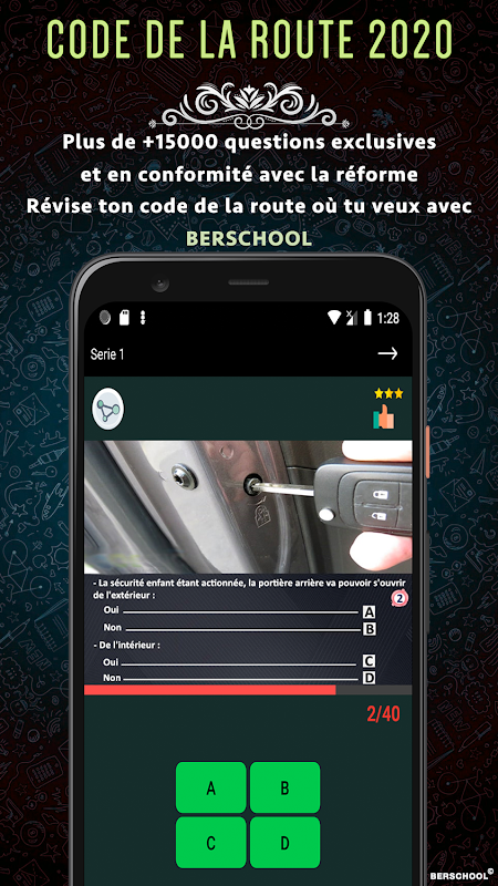 Это приложение является решением, позволяющим вам пересмотреть экзамен французского дорожного кодекса и поставить максимальные шансы на получение водительских прав.