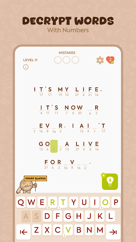 Благодаря более чем 500 уровням и 10 000 цитат, тщательно созданных для Cryptogram: Number & Word Game, вы столкнетесь с разнообразными задачами, от расшифровки криптограмм до взлома сложных кодов. Игра включает в себя такие элементы, как анаграммы, кроссворды, гарантируя, что каждый игрок найдет головоломку по своему вкусу. Включение известных цитат, контекстных подсказок и словесных ассоциаций добавляет дополнительный уровень интеллектуальной глубины в опыт Cryptogram: Number & Word Game.