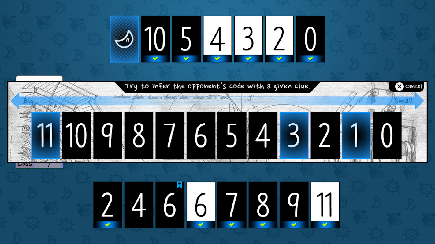 Он используется 24 карт (черных 0 ~ 11, белых 0 ~ 11) в нормальном режиме игры и 26 карт включают джокер в режиме джокера. Прежде всего, вы выбор 4 карты и вы можете принести карту из колоды, и угадать число на выбор одну карту вашего противника в ваших поворотах. Если вы правы, вы можете угадать число подряда или можете пройти поворот к сопернику. Если вы неправильно, вы должны раскрыть Lastest принести карту и включите передается другой стороне.