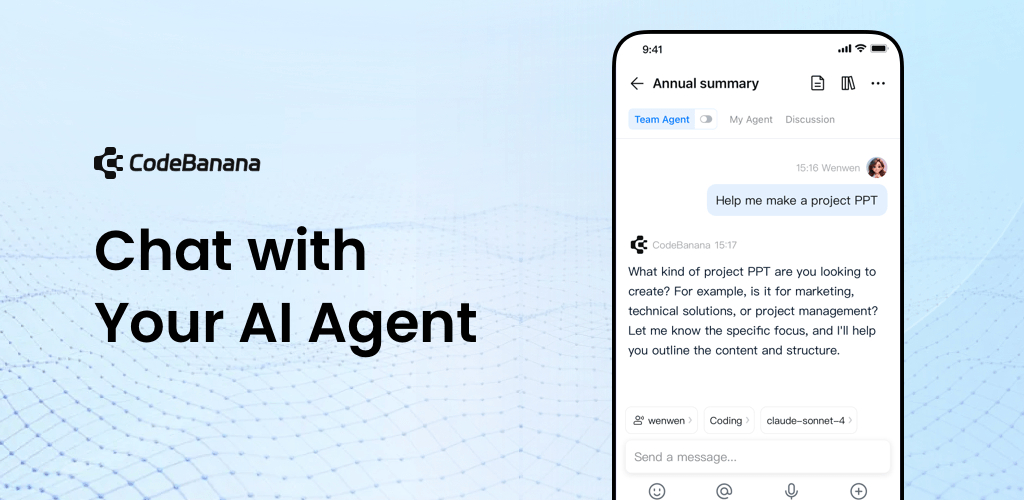 CodeBanana is an AI-powered team collaboration platform that brings large language models into your daily workflow. Create project spaces with built-in AI Agents, communicate with your team in real time, and turn conversations into actionable insights.