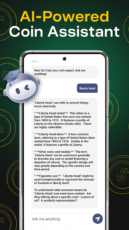 Get quick answers to all your coins related questions with the app’s AI-powered assistant. Whether it’s using the coin identifier or coin value checker, the AI provides fast, reliable responses to enhance your collecting experience.
