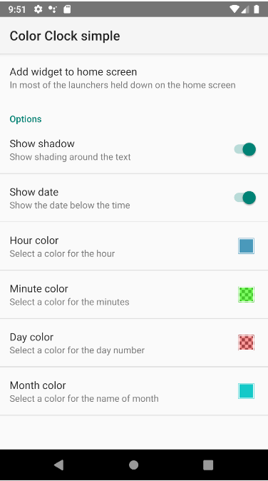 * Возможность изменения цвета каждой части часов (время, минуты, день, месяц)
