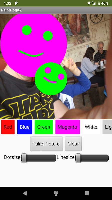 You can colour your picture and take a photo of something and colour it with a bunch of colours like Magenta, Red, Green, Light blue Blue and more! If you are done with a colour you can press clear and whoosh everything (except for the picture) is gone!