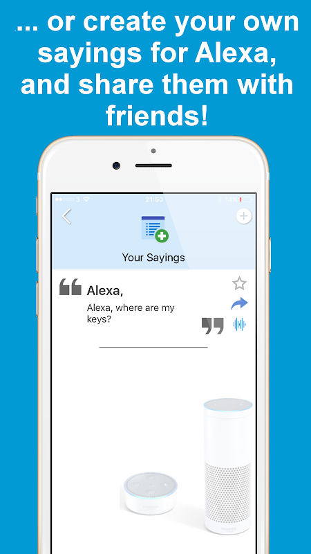 Use our Commands for Alexa Echo App to create your own sayings for your Amazon Alexa device, and then share them with your friends!