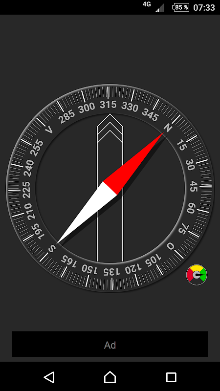Традиционный компас с хорошим, чистым дизайном. Северные и южные иглы и циферблат градусов поворачивается в зависимости от перемещения устройства. Приложение требует магнитный датчик, чтобы иметь возможность работать. Калибровка магнитного датчика имеет важное значение для хорошей точности и текущее состояние калибровки можно увидеть в калибровке в нижнем правом углу. Нажмите эту шкалу для получения дополнительной информации о процессе калибровки. Корпус компаса имеет ориентацию со стрелкой, указывающей в прямом направлении для устройства, это может быть использовано для компаса компасом.