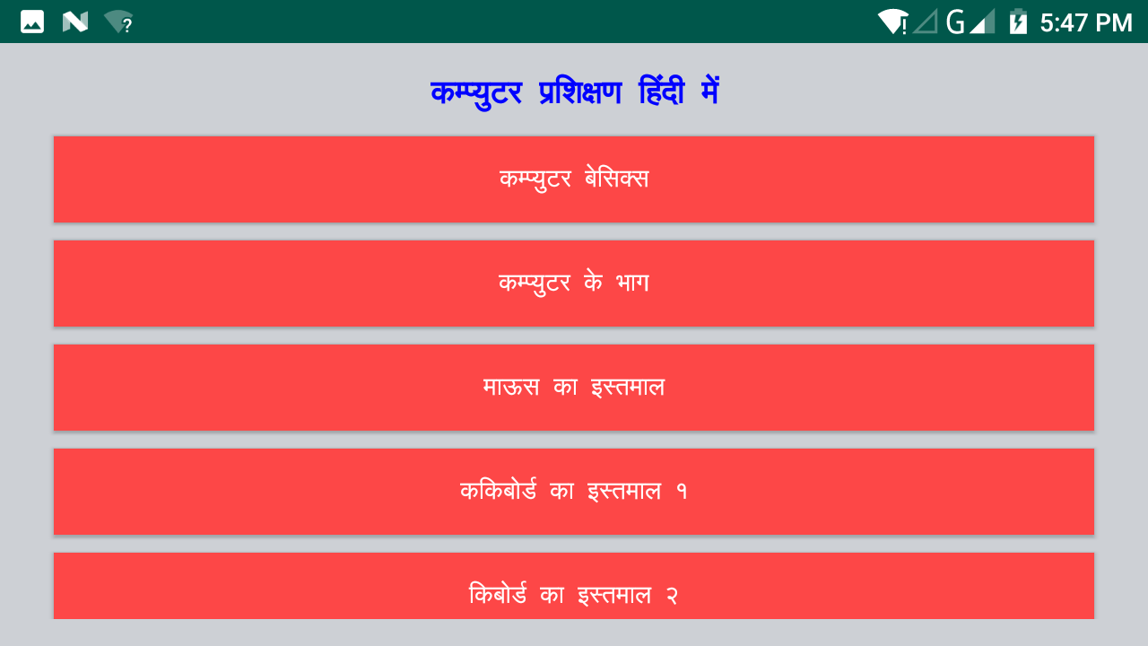 इस अॅप में आप कम्प्युटर बेसिक्स, कम्पयुटर के भाग, माऊस का इस्तमाल, किबोर्ड का इस्तमाल, कम्प्युटर बंद करना.