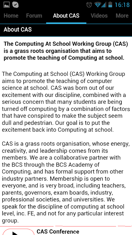 The Computing At School Working Group (CAS) is a grass roots organisation that aims to promote the teaching of Computing at school.