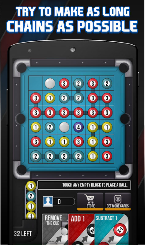 Place Balls on the Pool Board , Once you are over with your chance , its the machine which places the ball and always tries to spoil your game . Try and make longer chains of the same pool ball number , connect 3 or more same balls to increase it to the ball of next number .