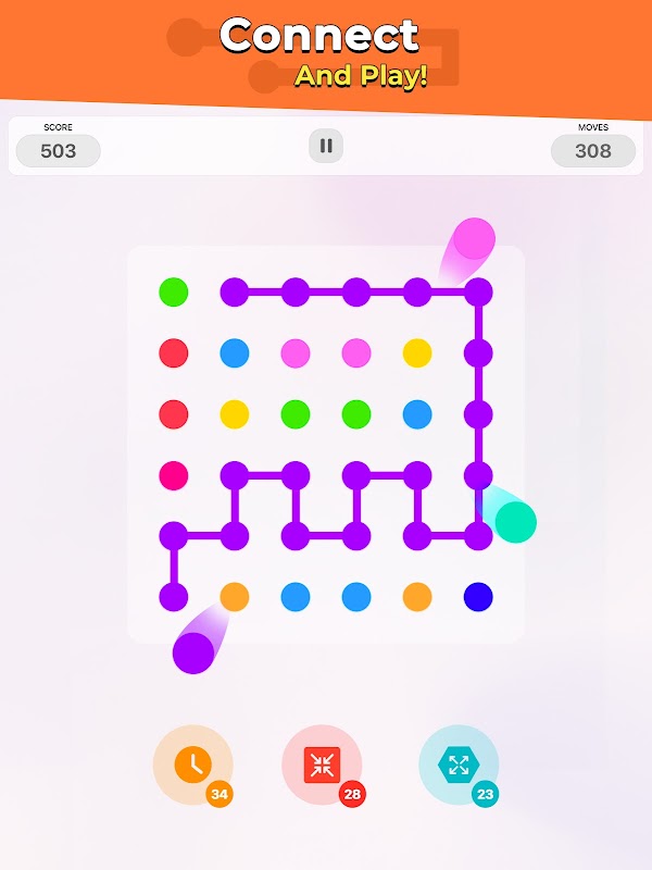 В Dots есть три режима для любого типа игроков. Соревнуйтесь со временем в режиме Timed, стратегически мыслите в режиме Moves или расслабьтесь в бесконечном режиме. Накапливайте точки по пути, чтобы получать бонусы.