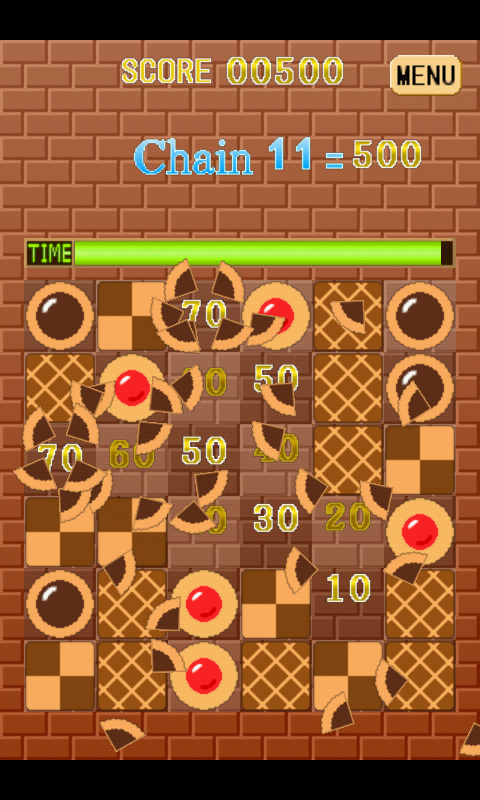同じ種類のクッキーが繋がっていると連鎖して砕けます。連鎖数が多いほどポイントも多くなります。