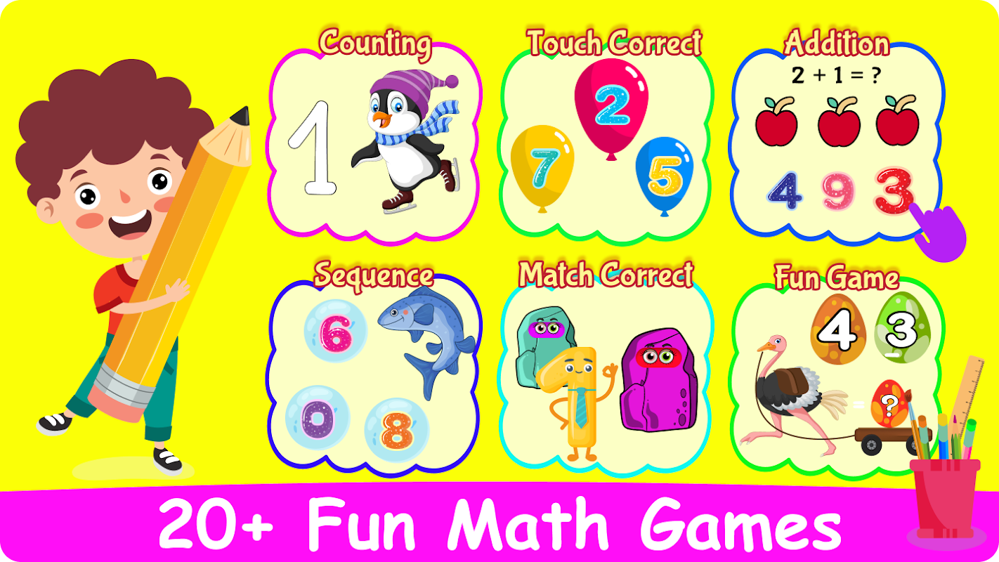 Числа и математика являются строительными блоками образования, и изучать их будет весело с этим приложением числовых игр для детей! Это детское приложение игр деления и умножения математики сочетает в себе креативность и логику, чтобы сделать изучение математики детьми простым и увлекательным.