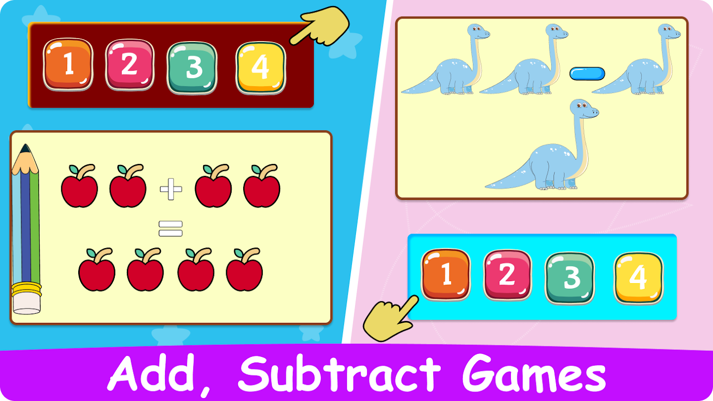 Вы ищете веселый и образовательный способ научить своих детей математике? Не ищите дальше! Это веселое детское приложение математических игр разработано, чтобы познакомить детей с математическим сложением и вычитанием, детским умножением и делением самым увлекательным способом.