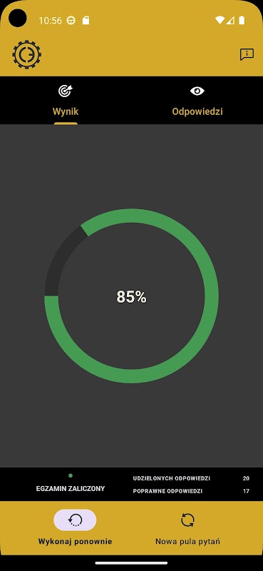 - режим экзамена - симуляция экзамена (по необходимости: 20 случайных вопросов, время - 30 минут, проходной порог - 16 (макс. 4 ошибки));