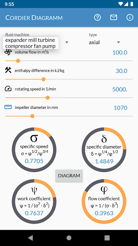 Cordier Diagram - это швейцарский армейский нож для вашего первого опыта в проектировании турбомашин. С помощью этого приложения вы можете определить тип (осевой, диагональный, радиальный) вашего компрессора, насоса, вентилятора, турбины или мельницы. Рассчитайте диаметр на основе объемного расхода, удельной энтальпии и скорости или используйте обратный расчет для расчета объемного расхода или скорости при заданной геометрии.