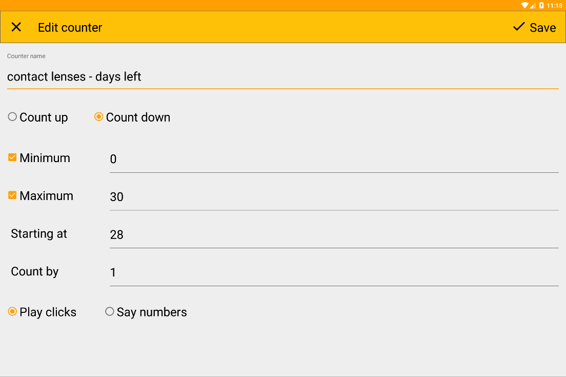 Настройте именованные счетчики, которые подсчитывают или обращают внимание, с минимальными / максимальными значениями, начальными значениями, регулируемыми шагами и вашим выбором звуковых сигналов, речи или вообще никакого звука.