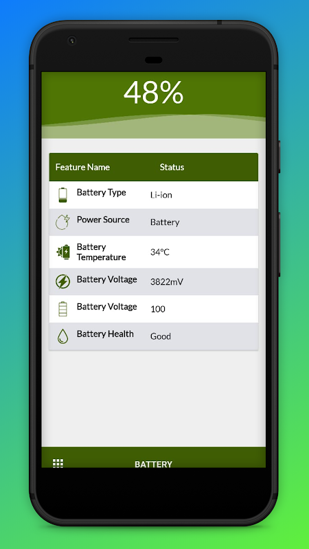 - Battery information : Battery level, Status, Battery Health, Temperature, Voltage ;