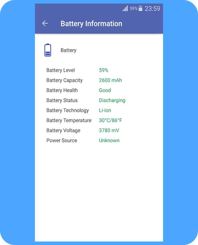 <> Battery : Health, current level, power source, temperature, voltage.
