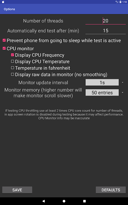 Это приложение отображает производительность на графике и показатели максимальной, минимальной и средней производительности. После тестирования приложения будет анализировать данные, чтобы найти, если и сколько дросселирования процессора произошло.