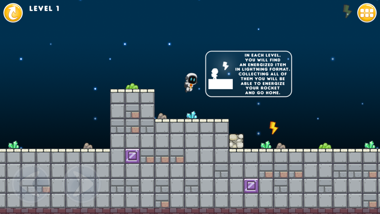 Для управления Космонавтом используйте сенсорные кнопки на экране. Обратите внимание на обучающие материалы на первых уровнях, чтобы не упустить ни одной детали!