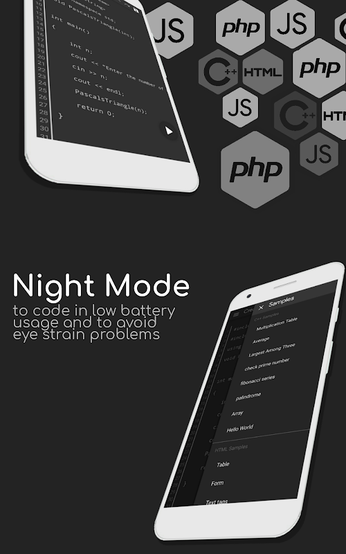 IDE для HTML, C ++, PHP, Perl, Python и других 68 языков на Android Mobile