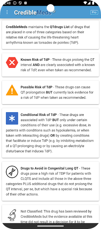 Это мобильное приложение CredibleMeds поддерживает веб-сайт CredibleMeds.org, который поддерживает и публикует списки лекарств в категориях, отражающих их способность продлевать интервал QT на электрокардиограмме и / или вызывать опасную для жизни сердечную аритмию, torsades de pointes (TdP).