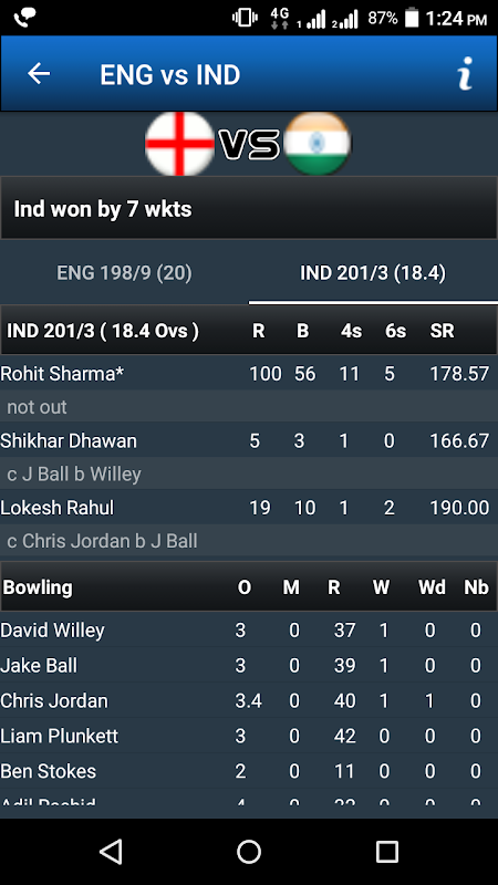 clicking any match user can see full score card of the selected match.