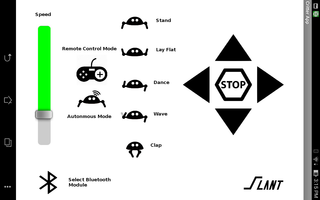 This bluetooth app give your android device full control of the Critter Arduino Robotics Kit. You can control the Critter step by step, or put it into several different modes.