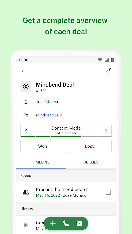 С Pipedrive для Android у вас будет доступ к вашим контактам, истории сделок и задачам, вы сможете создавать новые задачи и записывать заметки о встречах в любом месте – все изменения мгновенно синхронизируются с веб-приложением Pipedrive.