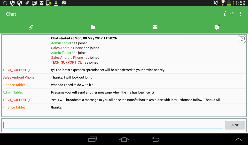 - Chat: Both the Client and Control can initiate a one-to-one text Chat session. The Client can also join a group discussion initiated by the Control.