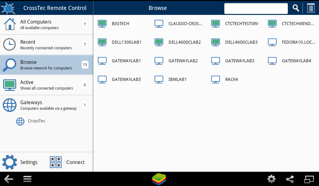 The mobile Control allows a user to quickly search and connect to both local computers by either IP address or PC name, or to browse, connect and view remote computers utilizing the free CrossTec Internet Gateway component.