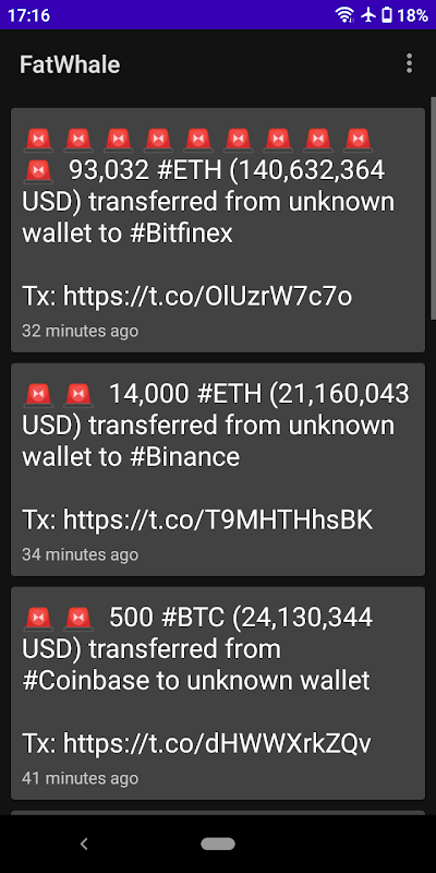 FatWhale - это самое быстрое и самое легкое приложение для оповещения о китах для всех транзакций блокчейна, собирающее самые большие транзакции, происходящие в индустрии криптовалют.