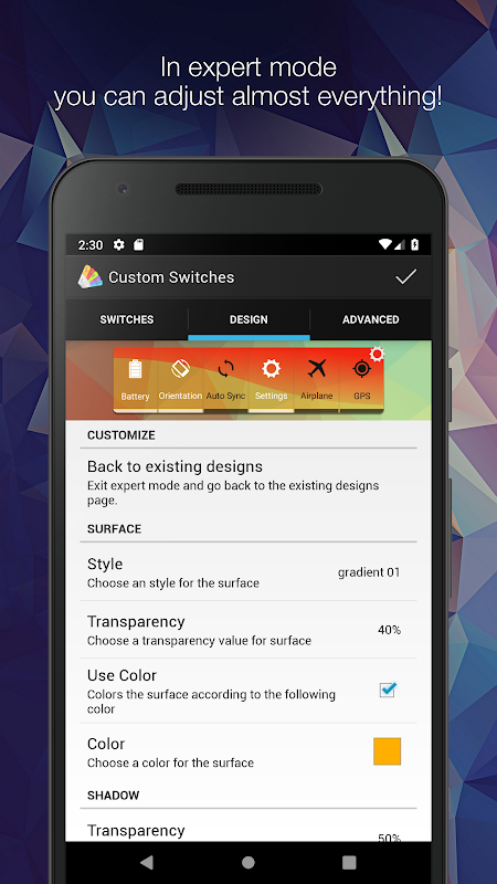 Custom Switches lets u place switch widgets on your home screen enabling you to toggle different system settings. You can add switches of your choice to the widget and change the design as you like. It’s up to you to choose one of several predefined designs and edit them or to create your own design. Due to its configurability, Custom Switches adjusts to every home screen!