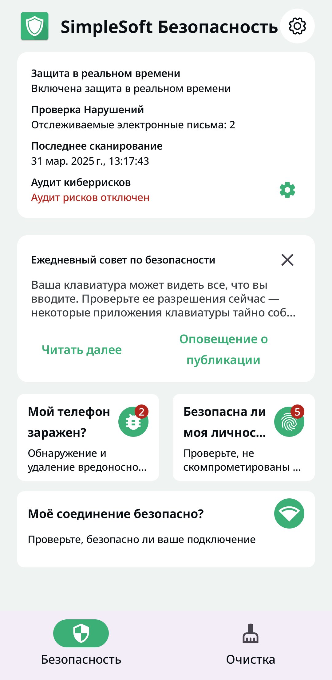 "Кибербезопасность и Антивирус" обеспечивает постоянную защиту, сканируя уязвимости, предупреждая о подозрительной активности и помогая поддерживать более безопасную цифровую жизнь. Повысьте уровень вашей кибербезопасности и оставайтесь бдительными для защиты устройства и ценных данных.