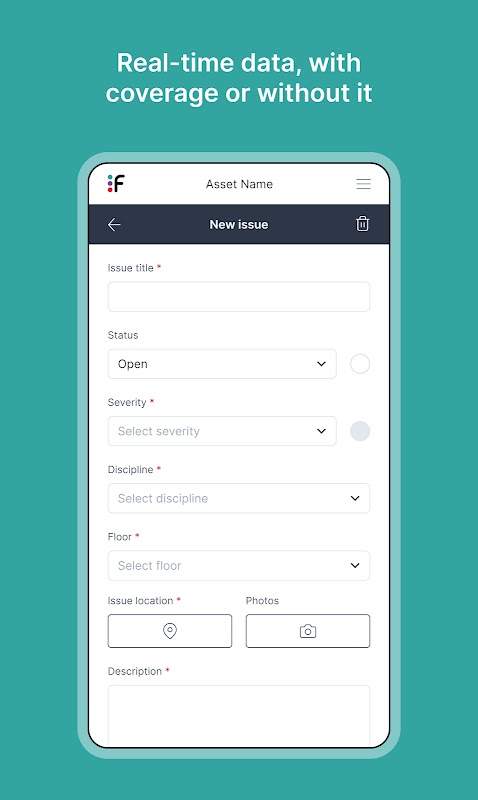 Используйте заранее определенные формы проблем или попросите нас настроить вашу конкретную форму или контрольный список для удовлетворения конкретных требований вашего проекта. Вы можете проводить проверки любого типа, иметь в офисе данные о объектах в режиме реального времени и создавать автоматические отчеты о состоянии активов.
