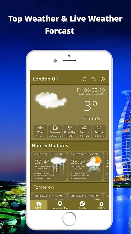 ☀️ This daily weather app weather tracker display current temperature, daily and hourly forecasts, sunrise and sunset time, humidity, wind speed and air pressure with weather today & weather tomorrow.