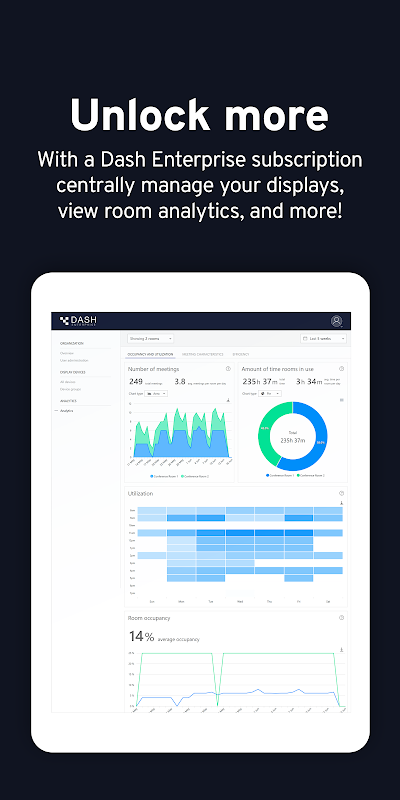 Если вам нужно больше, подписка Dash Enterprise позволяет централизованно управлять и настраивать ваши устройства отображения Dash и получать информацию об использовании конференц-зала с помощью аналитики помещений.