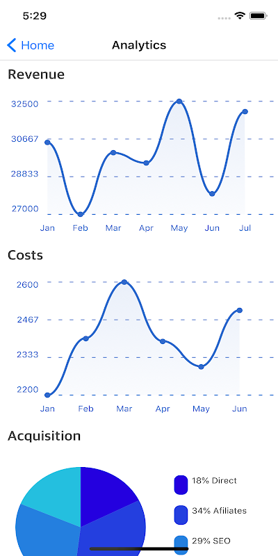 Download this admin dashboard app written in React Native to test out our beautiful fully functional React Native Dashboard app. The app is integrated with Firebase Auth & Firestore backend. It has screens for dashboards, charts, analytics, sales feed, etc.