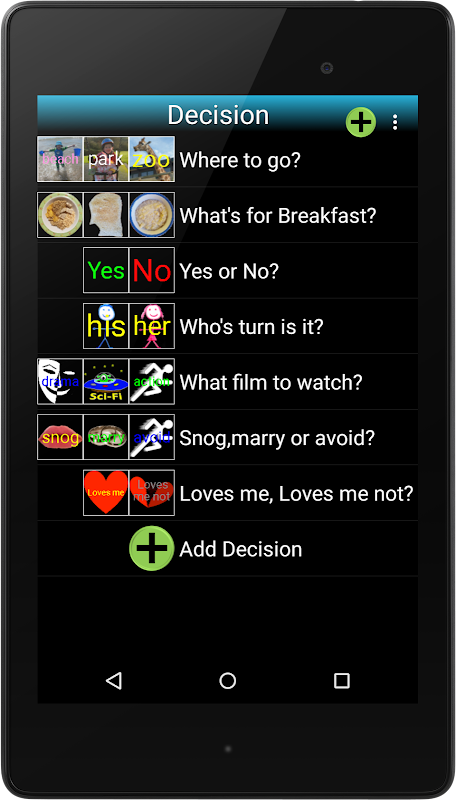 Мы начали тебя с некоторыми заданными решений, или Вы можете добавить до 30 для вашего собственного личного контакта. При использовании решения колесо вы можете выбрать, чтобы выключить его дополнительный звуковой эффект, и вы даже можете выбрать, чтобы увидеть Роберта Робот принять решение для Вас, который отлично подходит для развлекательных маленькие!