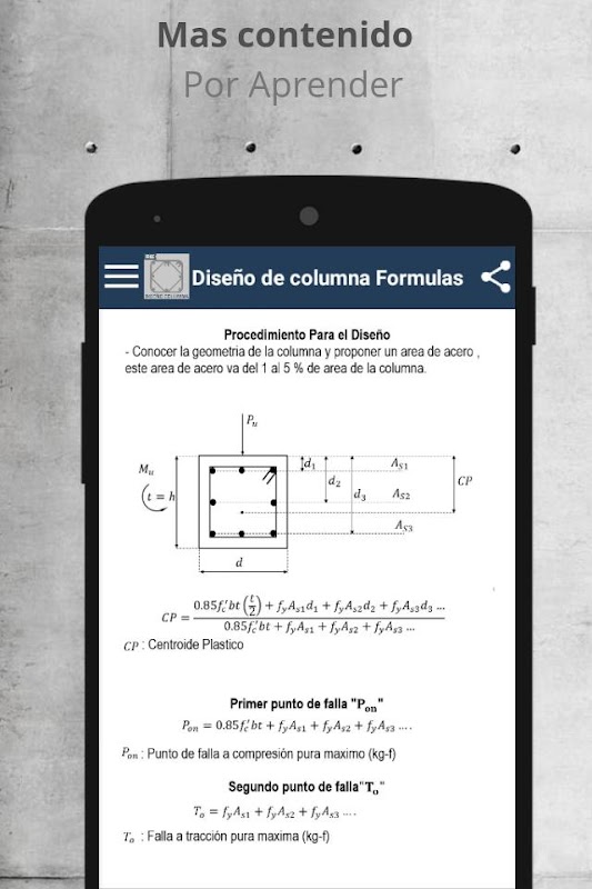 Descarga gratis la nueva aplicación Diseño de columnas a flexo compresión Formulas una aplicación de contenido de formulario diseño de columnas de concreto armado o hormigón armado como material de apoyo para tu trabajo, educación y estudio de la materia que podrás descargar y compartir con tus amigos, disponible para dispositivos Android.