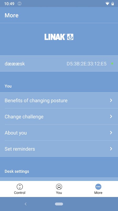 Сопряжение с помощью беспроводной технологии Bluetooth® позволяет перемещать стол вверх и вниз и устанавливать свое любимое положение. Приложение LINAK® Desk Control ™ работает с настольными системами LINAK с использованием одной из панелей DPG: DPG1M, DPG1B или DPG1C. Также применяются системы LINAK с адаптером Bluetooth® (BLE2LIN002).